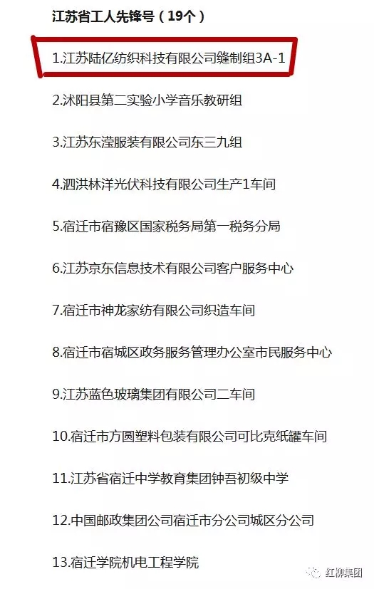 近日,宿遷市總工會發(fā)布了宿遷市省五一勞動獎狀、獎?wù)隆s譽獎?wù)潞褪」と讼蠕h號(集體)推薦人選公示的名單。紅柳集團陸億紡織縫制3A-1組入圍2018年度江蘇省“工人先鋒號”推薦名單。